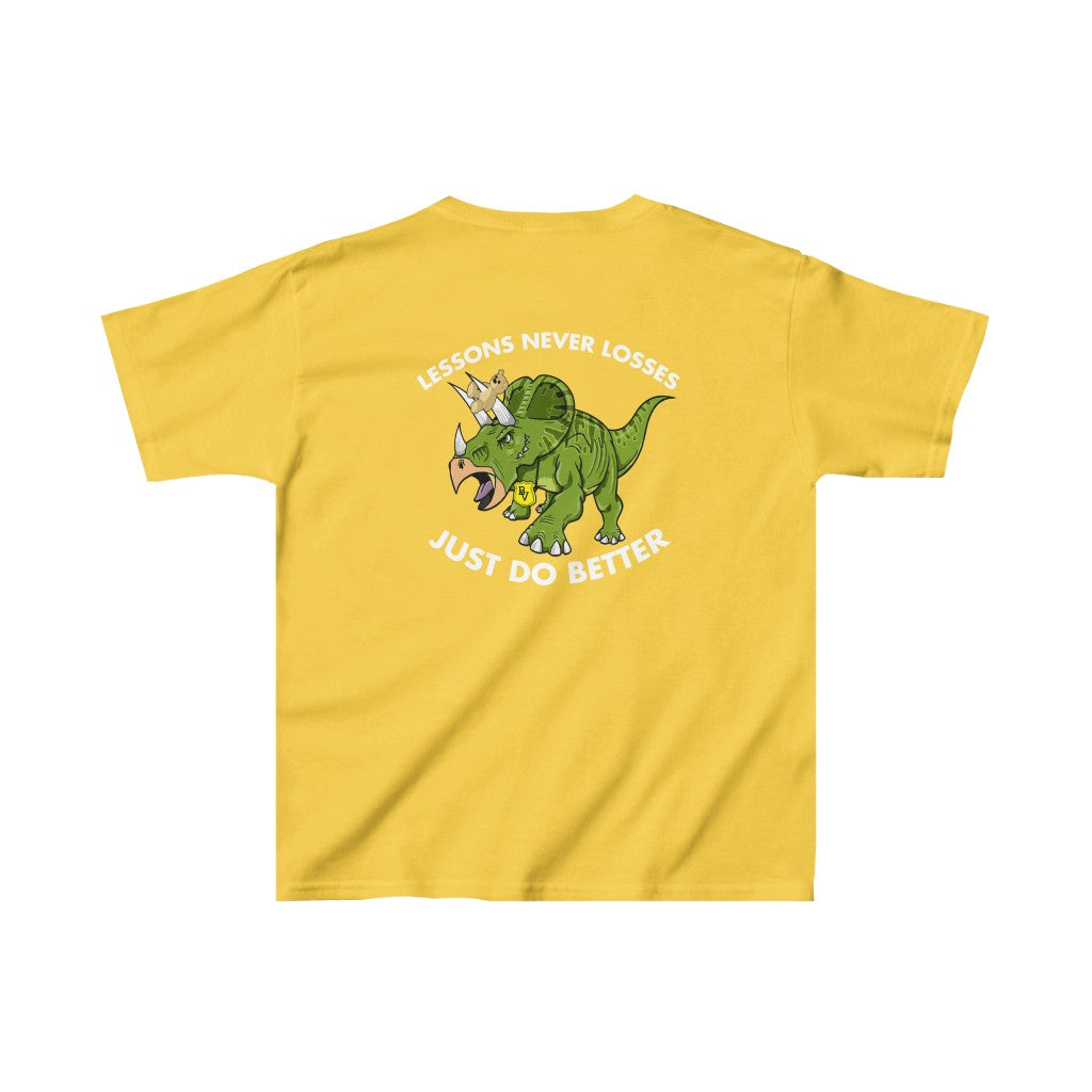 The kids heavy cotton tee is perfect for everyday use. The fabric is 100% cotton for solid colors. Polyester is included for heather-color variants. The shoulders have twill tape for improved durability. The collar is curl resistant due to ribbed knitting. There are no seams along the sides.